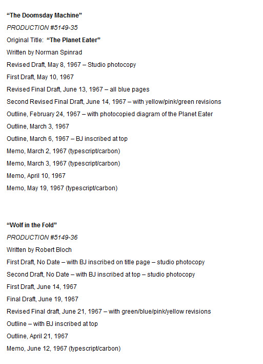 Presented below is the complete lot description, including the full set of auction catalog photos and a detailed inventory list, for the massive TOS Desilu production materials archive that recently sold for an impressive $70,400 as Lot 547 in Julien's June 2015 Hollywood Legends Auction. This collection, consisting of approximately 173 total script drafts and 94 story outlines, represents one of the largest Original Series document archives ever sold at auction and is highlighted by the personal copies of production scripts originally distributed to key TOS personnel such as Bob Justman (producer), Joe Pevney (director), Joe D'Agosta (casting), Gene Coon (screenwriter) and Wah Chang (props). A centerpiece of the collection is a Star Trek story outline/proposal written by none other than William Shatner himself; one of just two known surviving copies of this document - which was ultimately never developed into an episode.